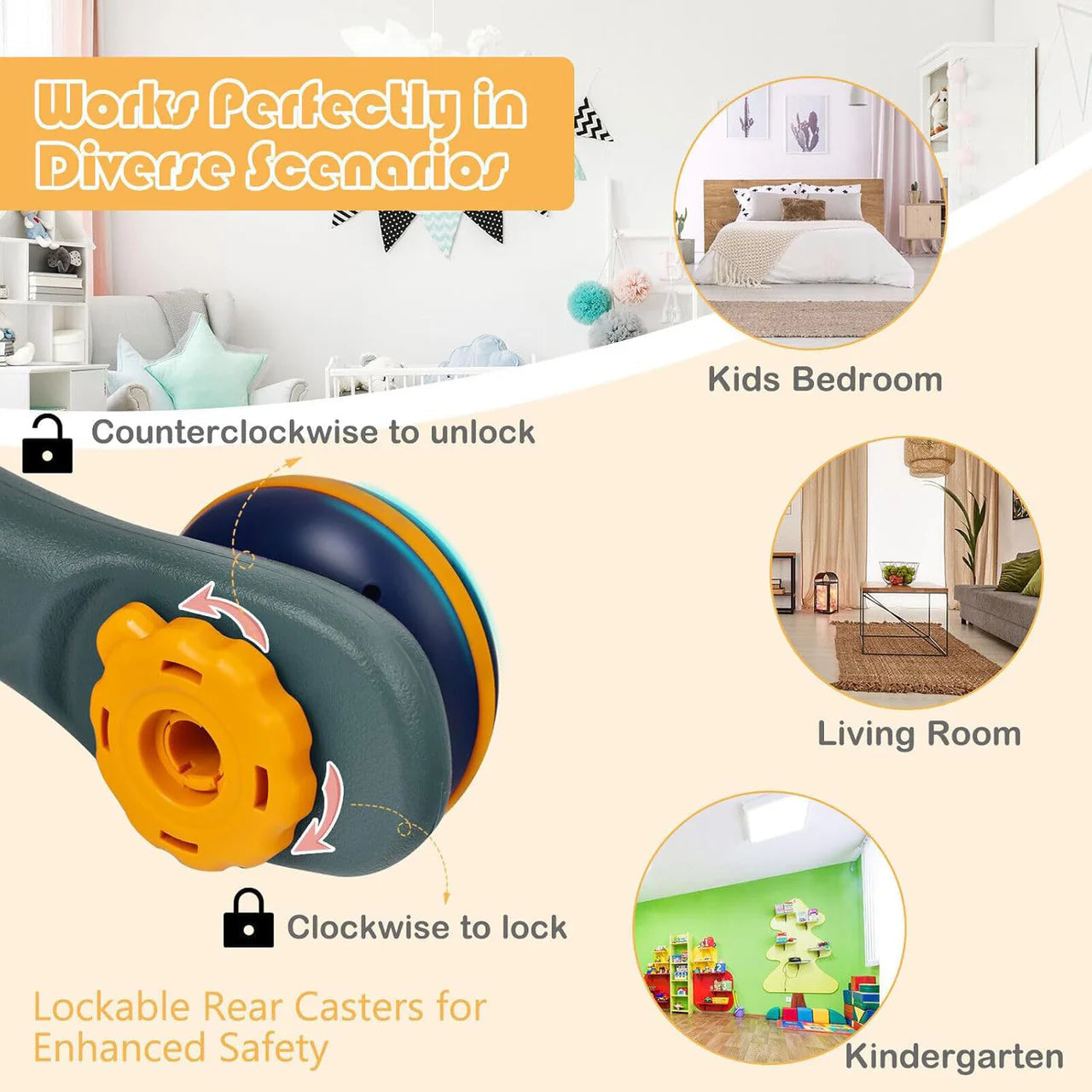 - Keep in Place: If your little one decides to sit for playing with the front panel, the lockable read wheels keep this baby push toy in place (clockwise for locking and counterclockwise for unlocking). Likewise, the anti-slip TPR rubber rings make wheels quiet to roll over.
